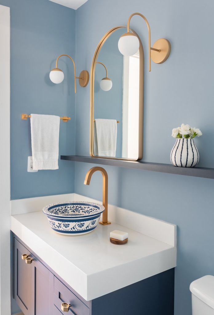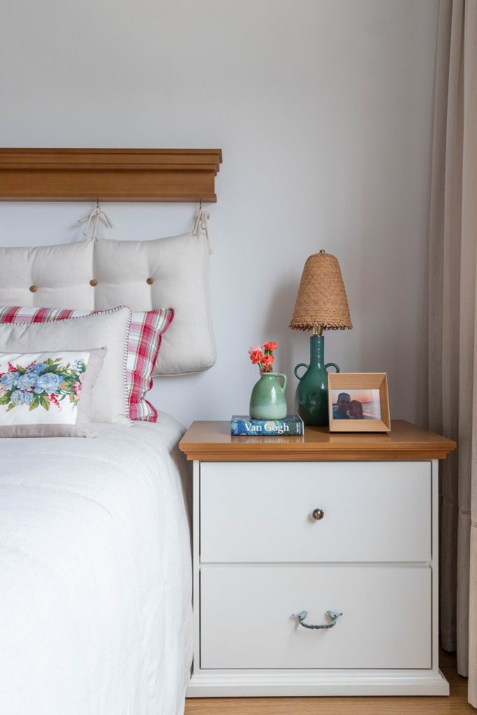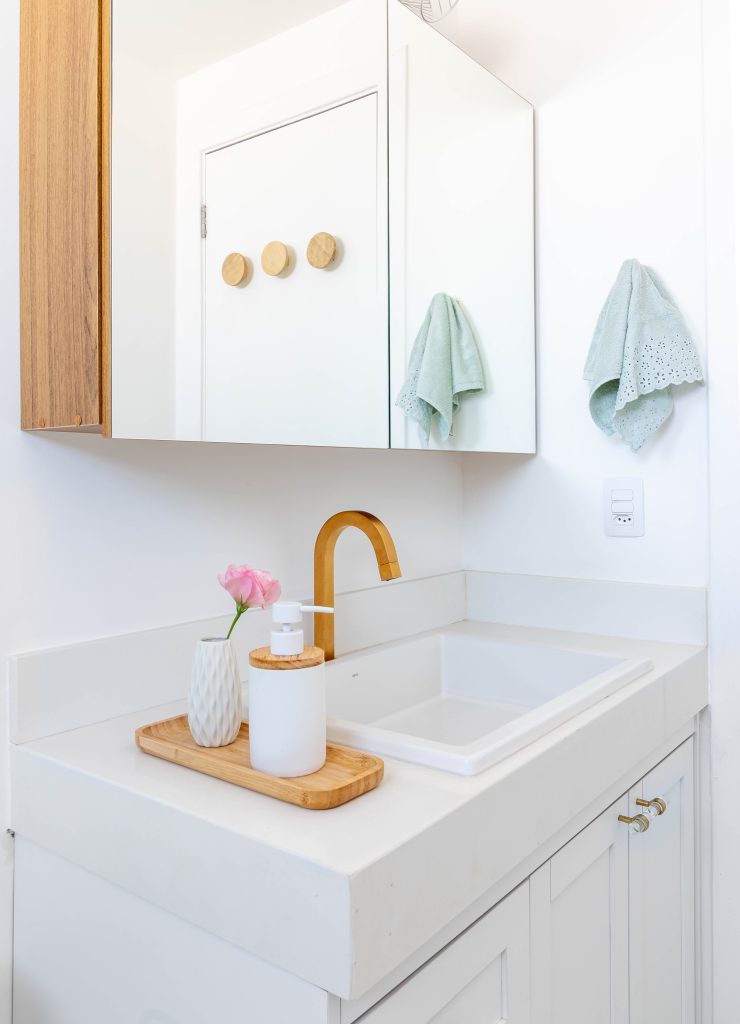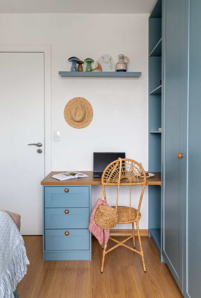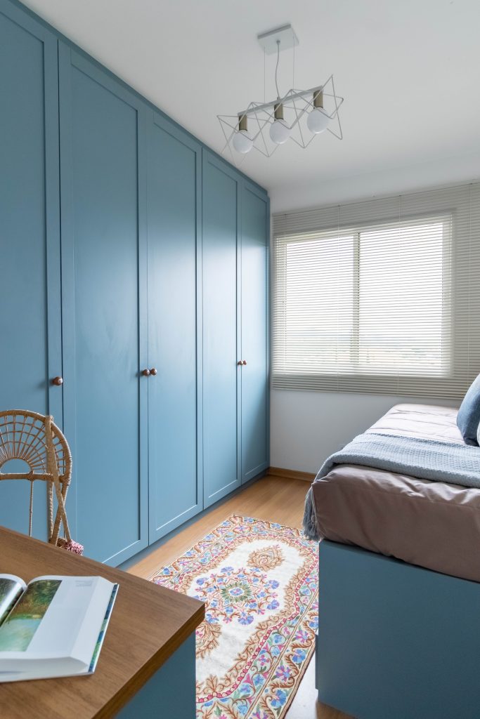A marcenaria foi toda desenhada de acordo com as necessidades dos moradores, e alguns detalhes deixaram esse projeto com mais personalidade, como os armários azuis, e a cuba pintada a mão no banheiro social.