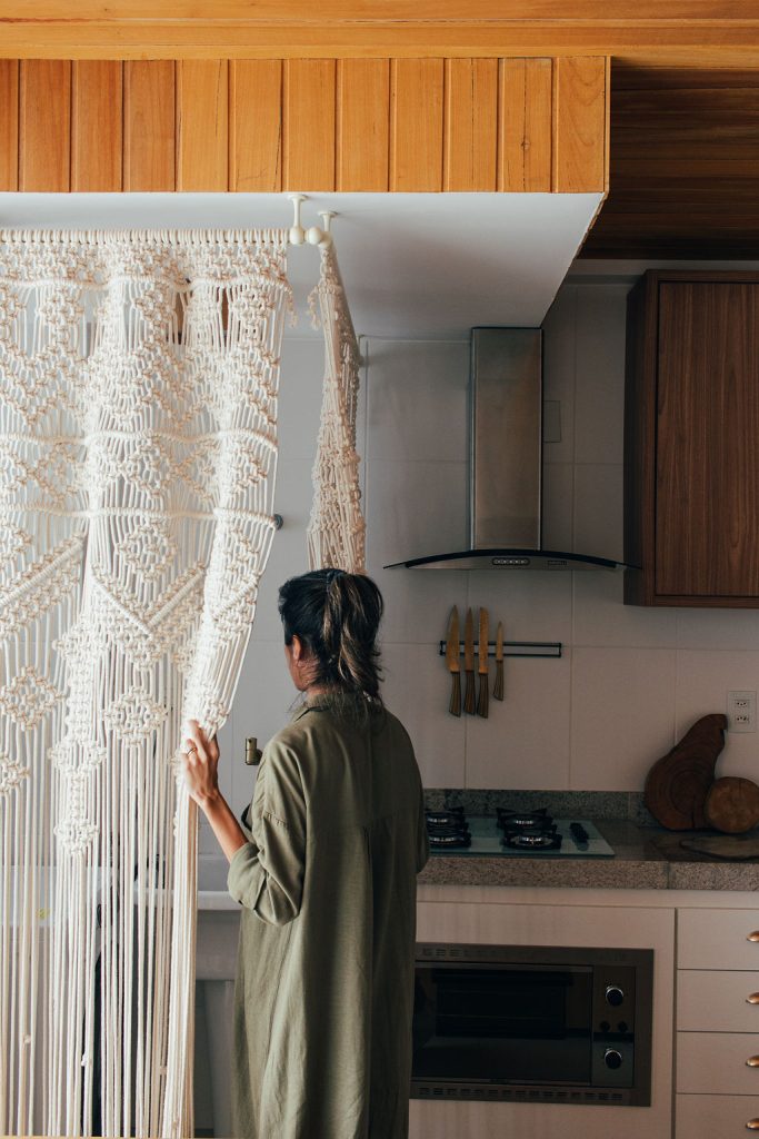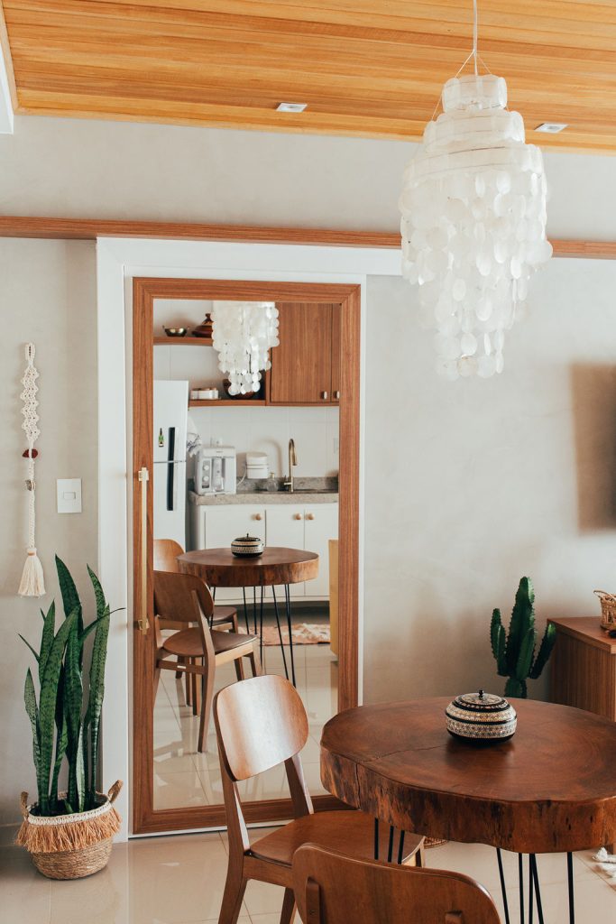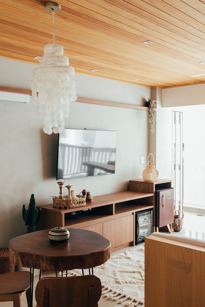 Para isso, foi feito um forro de madeira na sala e cozinha, aquecendo e trazendo aconchego aos ambientes. Os móveis soltos e despretensiosos também foram importantes para que esse resultado leve fosse alcançado aqui.